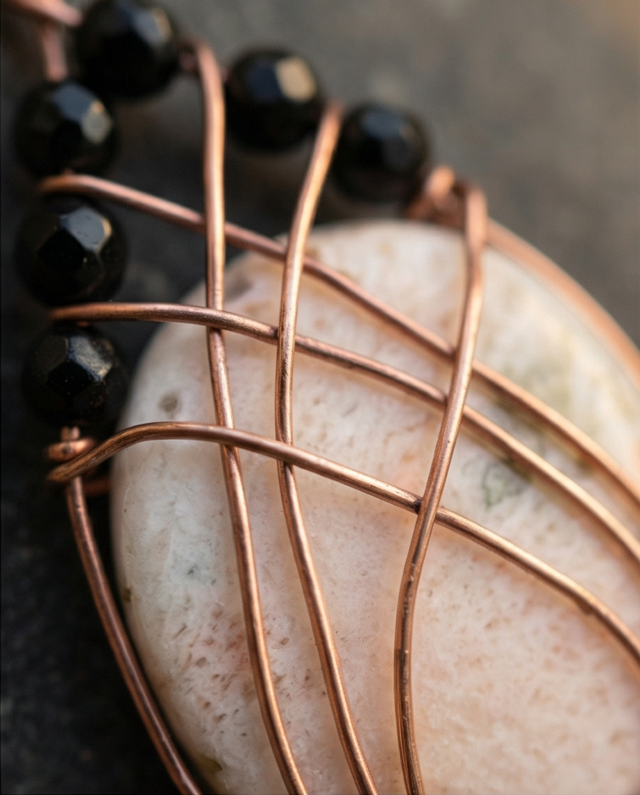 Handmade Scolecite pendant is wrapped in warm copper and accented with faceted black Onyx beads for bold contrast. A one-of-a-kind gemstone necklace combining peace and strength.